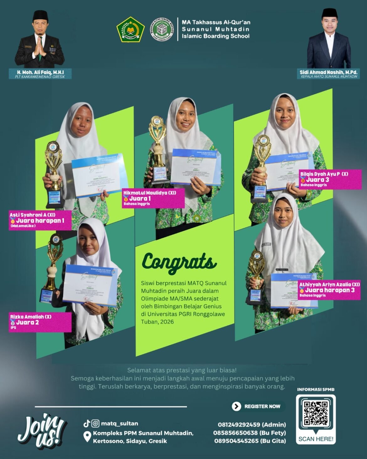 SABDANEWS.COM,Gresik – Kabar membanggakan datang dari Madrasah Aliyah Takhasus Al-Qur’an (MATQ) Sunanul Muhtadin. Beberapa santriwati berhasil meraih prestasi gemilang dalam ajang Olimpiade MA/SMA sederajat yang diselenggarakan oleh Bimbingan Belajar Genius di Universitas PGRI Ronggolawe Tuban pada tahun 2026.