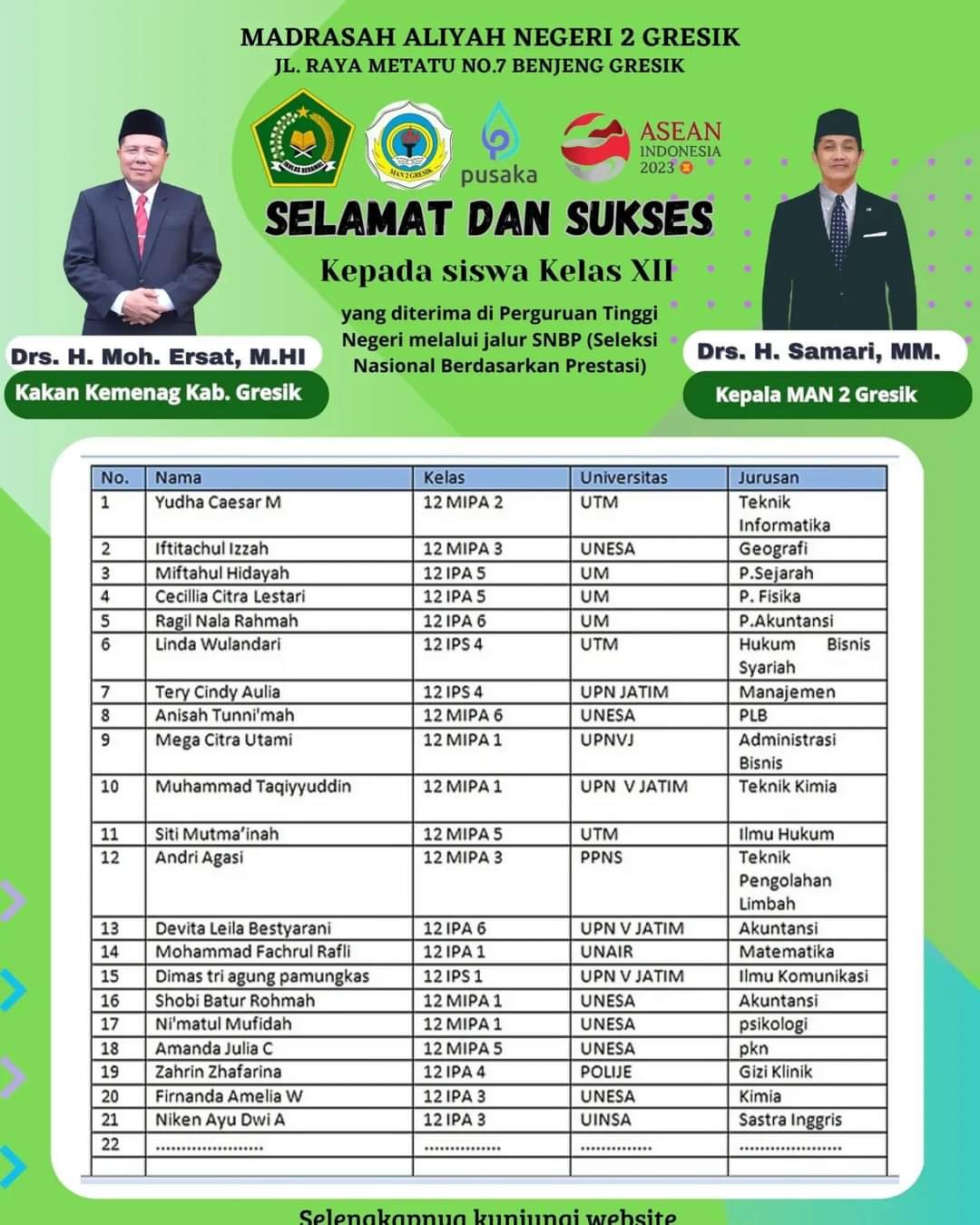 Berikut Data Siswa-Siswi MAN 2 Gresik yang diterima SNBP Tahun 2023:  1. Yudha Caesar M, 12 MIPA 2, UTM, Teknik Informatika,  2. Iftitachul Izzah, 12 Mipa 3, UNESA, P.Geografi, 3.Miftahul Hidayah, 12 IPA 5, UM, P.Sejarah, 4. Cecillia Citra Lestari, 12 IPA 5, UM, P. Fisika, 5. Ragil Nala Rahmah, 12 IPA 6, UM, P.Akuntansi