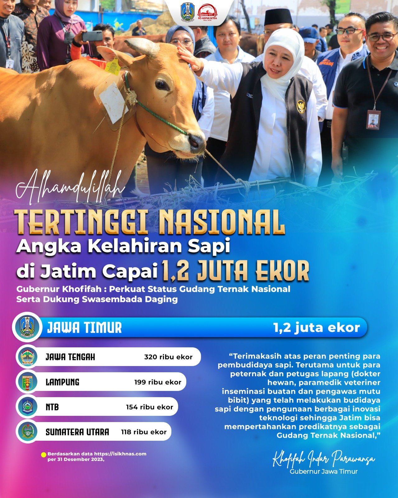 Atas capaian ini, Gubernur Jawa Timur Khofifah Indar Parawansa menyampaikan, angka kelahiran sapi yang tinggi ini akan memperkuat sekaligus mempertahankan status Jatim sebagai “Gudang Ternak Nasional”. Sehingga, akan bisa mendukung target swasembada daging di Indonesia.