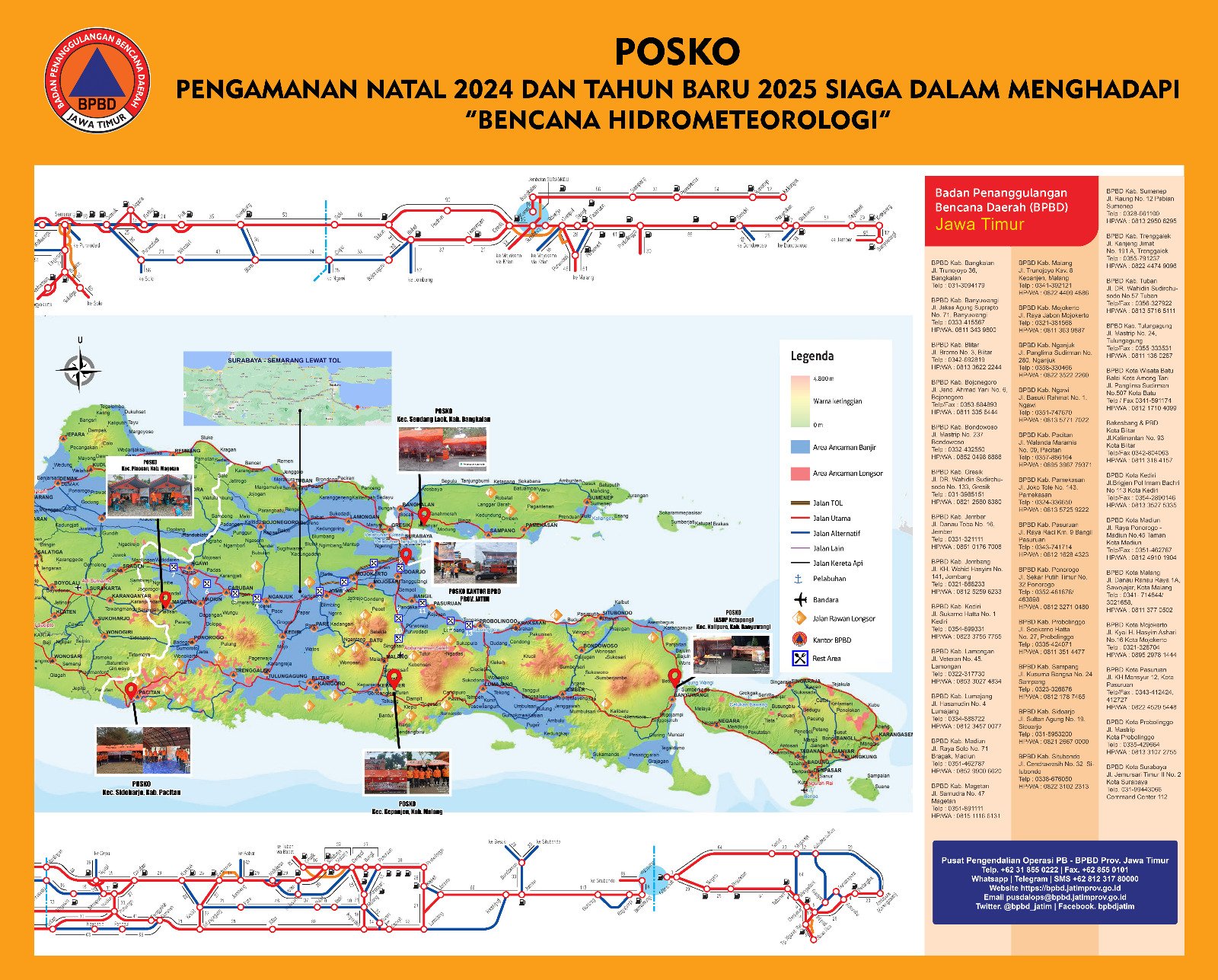 Kesemua posko ini terhubung dengan Posko Induk Siaga Bencana Hidrometeorologi di Kantor BPBD Jatim, Jl S. Parman, Waru Sidoarjo.