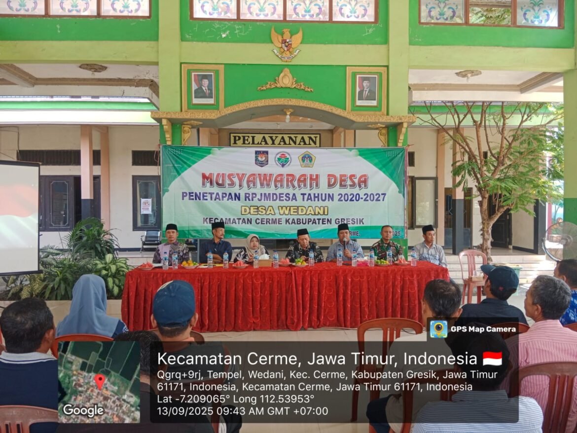 GRESIK, SabdaNews.com – Pemerintah Desa (Pemdes) Wedani, Kecamatan Cerme, Kabupaten Gresik menggelar musyawarah desa (musdes) dengan agenda tunggal pembahasan Perubahan Rencana Pembangunan Jangka Menengah Desa (RPJMDes) 2020-2027. Musdes diikuti seluruh pemangku kepentingan dan seluruh elemen desa. Juga dihadiri Camat Cerme Umar Hasyim dan anggota Forkopimcam, bertempat di balai setempat, Sabtu (13/9/2025).