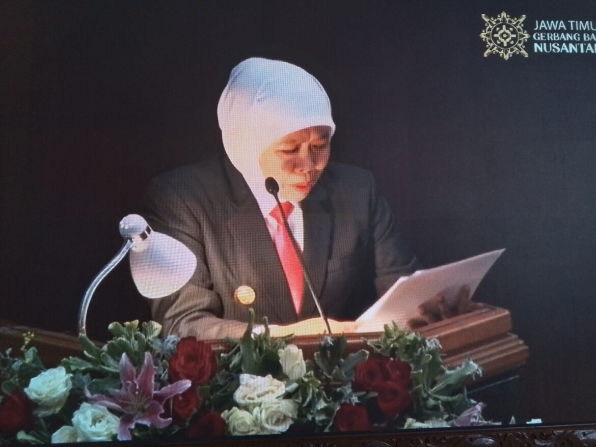 SabdaNews.com – Gubernnur Jawa Timur Khofifah Indar Parawansa menyampaikan Pengantar Nota Keuangan Raperda tentang Perubahan APBD Jawa Timur Tahun Anggaran 2025 usai mendengarkan pidato kenegaraan Presiden RI, Prabowo Subianto pada rapat paripurna istimewa dipimpin wakil ketua DPRD Jawa Timur Deni Wicaksono, Jumat (15/8/2025).