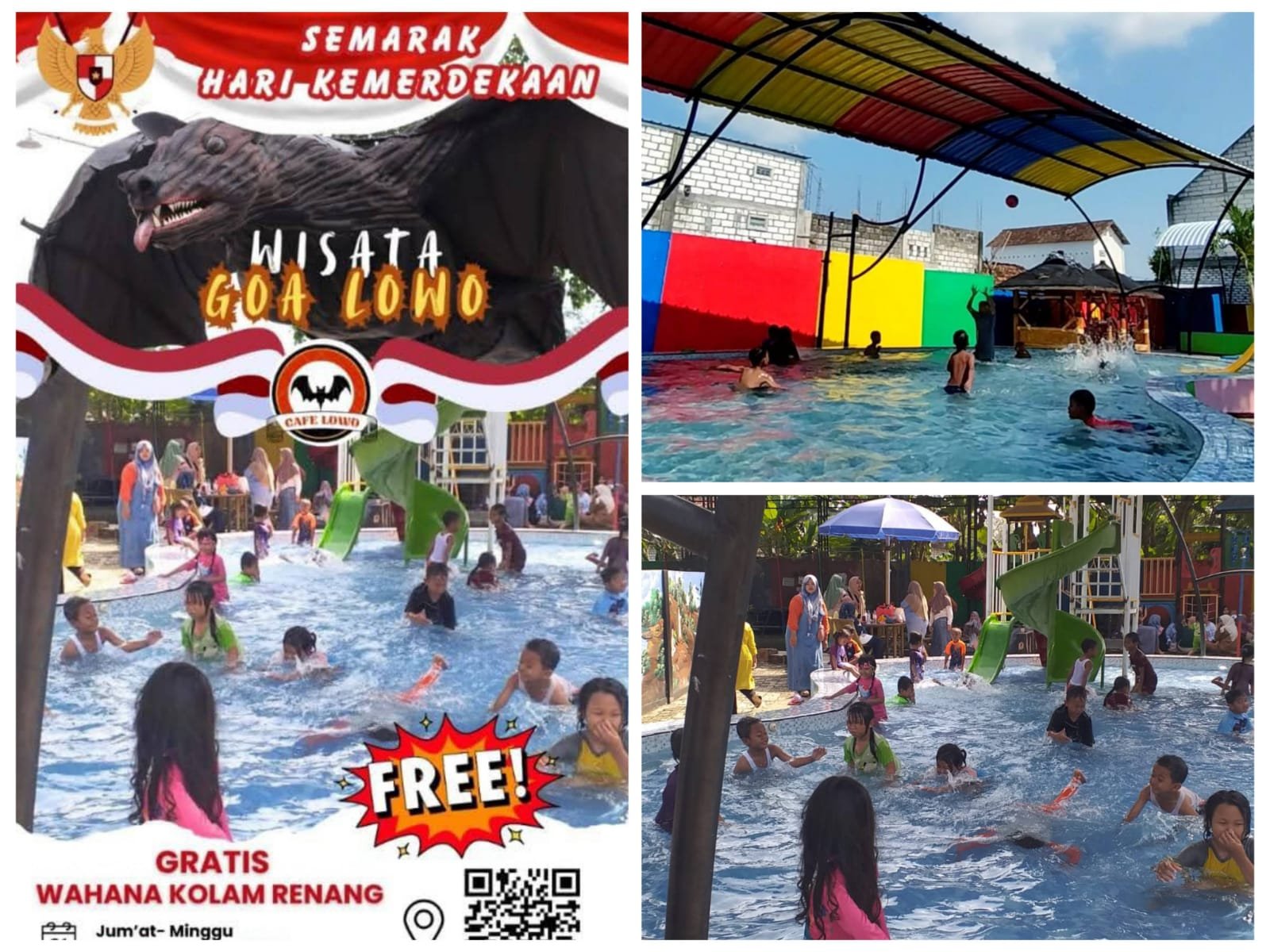 GRESIK,SabdaNews.com – Kabar Gembira datang dari Pemerintah Desa (Pemdes) Melirang, Kecamatan Bungah, Kabupaten Gresik, Jawa Timur. Melalui Bumdes eMHa (Melirang Hebat), Wisata Goa Lowo (WGL) dengan penuh rasa syukur memberikan Kado Spesial HUT RI ke-80, yakni Free alias gratis untuk wahana kolam renang. Pengunjung bisa berenang sepuasnya tanpa dipungut biasa di wahana kolam renang WGL Melirang Bungah berlaku mulai hari ini, Jumat Berkah (15/8/2025) hingga HUT Kemerdekaan RI ke-80 pada tanggal 17 Agustus 2025.