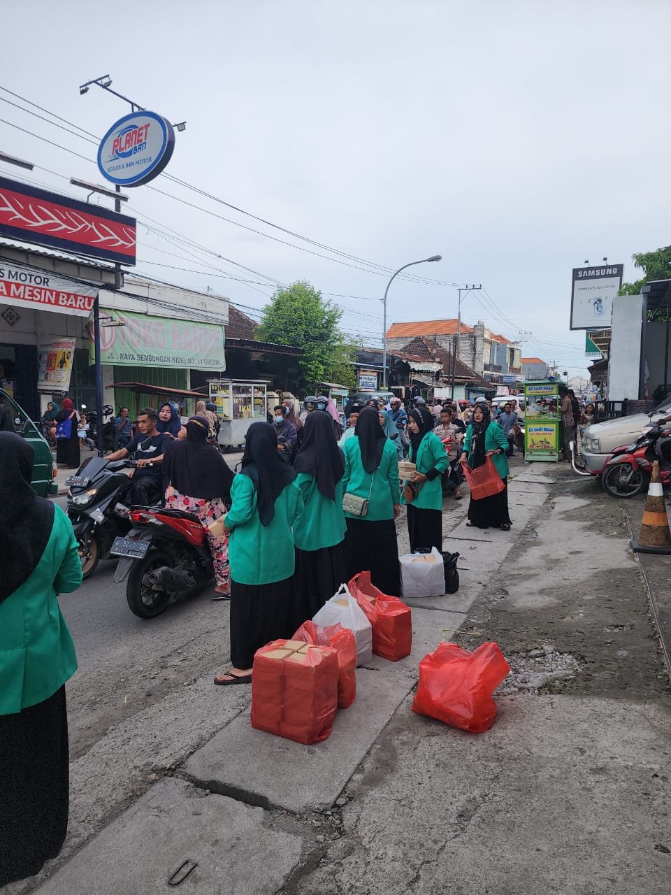Dengan seragam kebesaran “Ijo Ijo” yang menjadi ciri khas dari Banom Fatayat NU. Beberapa Anggota Fatayat NU Kalirejo memberikan Makanan ringan yakni Takjil untuk pembuka berbuka puasa. Dengan sigap dan cekatan serta senyum yang merekah ia dengan sabar memberikan pelayanan bagi pengguna jalan yang melintas sejumlah paket manfaat 750 takjil sekejap langsung habis. (13/4/2023)
