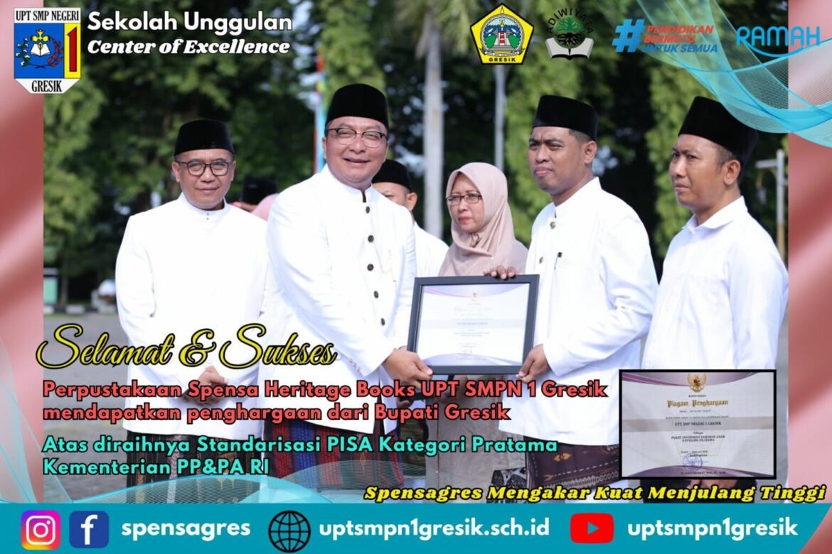 GRESIK ,SabdaNews.com- Tepat di hari Ultah Pemkab Gresik ke-51 dan Hari Jadi Kota Gresik ke-538, Bupati Gresik memberikan penghargaan kepada UPT SMPN 1 Gresik (Spensagres). Penghargaan tersebut diberikan atas keberhasilan Perpustakaan Spensa Heritage Books UPT SMPN 1 Gresik meraih Standarisasi PISA (Pusat Informasi Sahabat Anak) Kategori Pratama dari KemenPPPA RI (Kementerian Pemberdayaan Perempuan dan Perlindungan Anak Republik Indonesia).