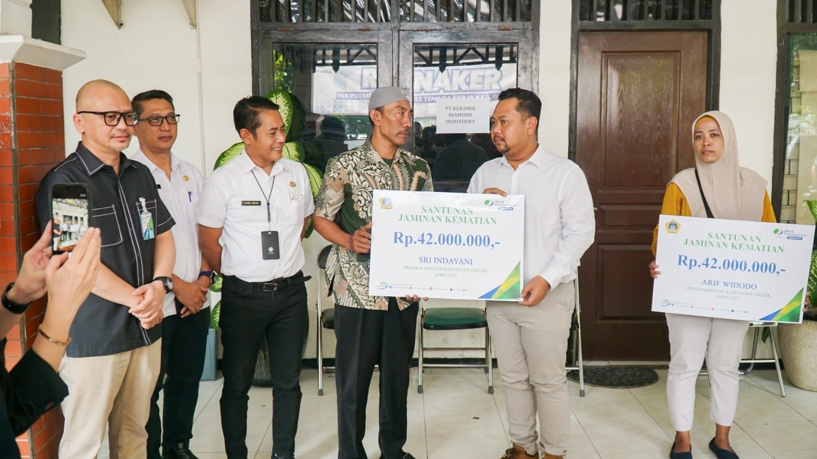 Dalam kesempatan yang sama, Bupati Yani juga menyerahkan Santunan Jaminan Kematian BPJS Ketenagakerjaan kepada dua ahli waris pekerja rentan Kabupaten Gresik yang dibiayai melalui APBD 2025. Santunan masing-masing sebesar Rp42.000.000 diserahkan kepada ahli waris almarhum Arif Widodo dan almarhumah Sri Indayani.