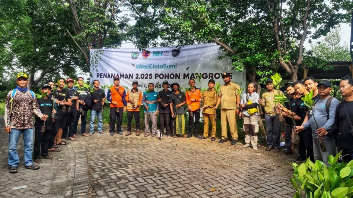 GRESIK-KEMENANG,SabdaNews.com- Lembaga Amil Zakat Nasional Nurul Hayat (NH) Gresik, Badan Penanggulangan Bencana Daerah (BPBD), Komunitas Kompak Adventure dan pegiat sosial menggelar aksi cinta bumi dengan melakukan penanaman pohon mangrove di Kalimireng Manyar Sidomukti, Kecamatan Manyar, Kabupaten Gresik, Selasa (22/4/2025).