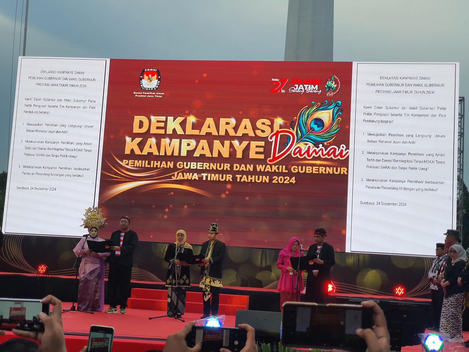 “Deklarasi kampanye damai pemilihan gubernur dan wakil gubernur provinsi Jawa Timur ini sebagai bentuk komitmen kita menyelenggarakan kampanye pilkada serentak 2024 dengan aman, damai dan kondusif,” tegasnya.