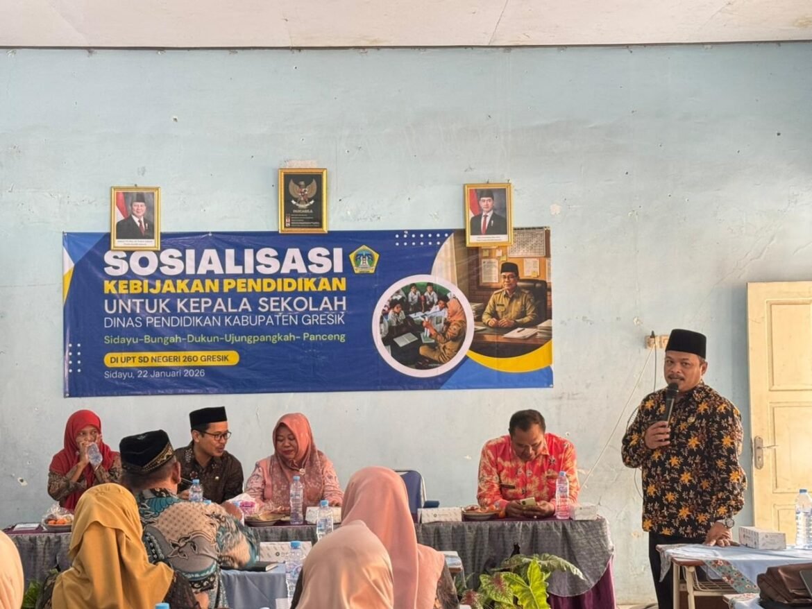 GRESIK. SabdaNews com- Kepala Sekolah diera DDinas Pendidikan Kabupaten Gresik Gelar Sosialisasi Kebijakan Pendidikan Untuk Kepala Sekolah Se-Wilker 1 Di UPT SD Negeri 260 Gresik.igital informasi saat ini dituntut meningkatkan kompetensinya sebagai managerial yang profesional di lembaga pendidikannya masing-masing artinya kepala sekolah dituntut pro aktif dalam update informasi digital pendidikan yang berkembang saat ini. Bertempat di Gedung UPT SD Negeri 260 Gresik , Dinas Kabupaten Gresik nenggelar Sosialisasi Kebijakan Pendidikan untuk Kepala sekolah se- Wilker 1, Kamis, ( 22/01/2026). Dr. Hj Nur Hamidah, S.Pd M.Pd .selaku Kepala Bidang Pengelolaan Pendidikan Anak Usia Dini dan Non Formal dalam arahan pembinaaan kepada kepala sekolah se- Wilker 1 di UPT SD Negeri 260 Gresik menyampaikan informasi Kebijakan Pendidikan kepada Kepala sekolah se wilker 1 tentang Peraturan Menteri Pendidikan Dasar dan Menengah Nomor 7 Tahun 2025 tentang Penugasan Guru sebagai Kepala Sekolah.