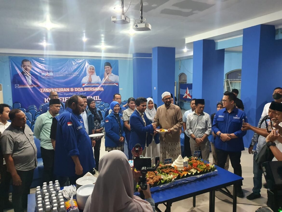 SabdaNews.com – DPD Partai Demokrat Jawa Timur sebagai salah satu partai pengusung pasangan calon gubernur Khofifah Indar Parawansa dan calon wakil gubernur Emil Elestianto Dardak pada Pemilihan Gubernur (Pilgub) Jawa Timur tahun 2024 menggelar syukuran secara sederhana atas capaian kemenangan yang diraih pasangan nomor urut 02 pada Pilgub Jatim 27 November kemarin.