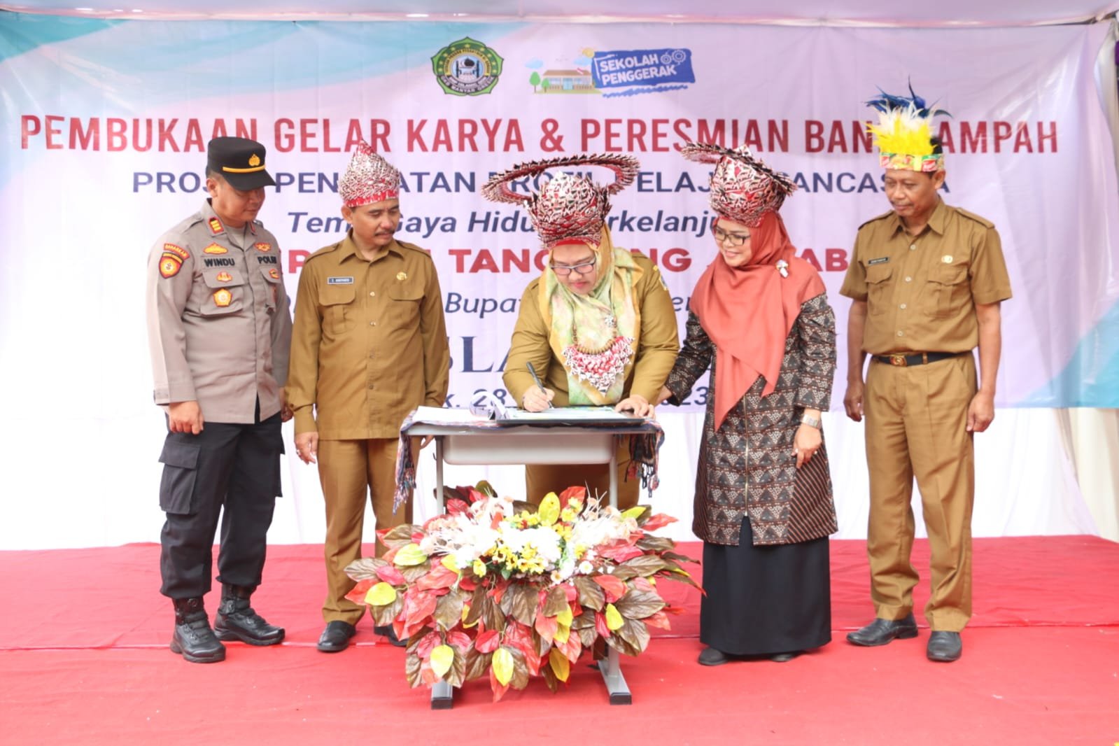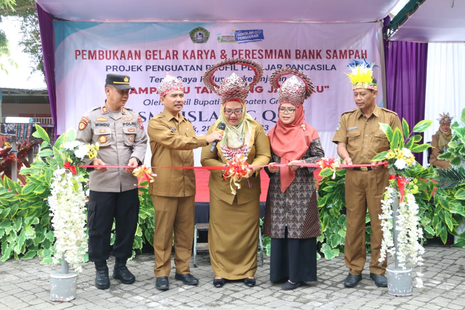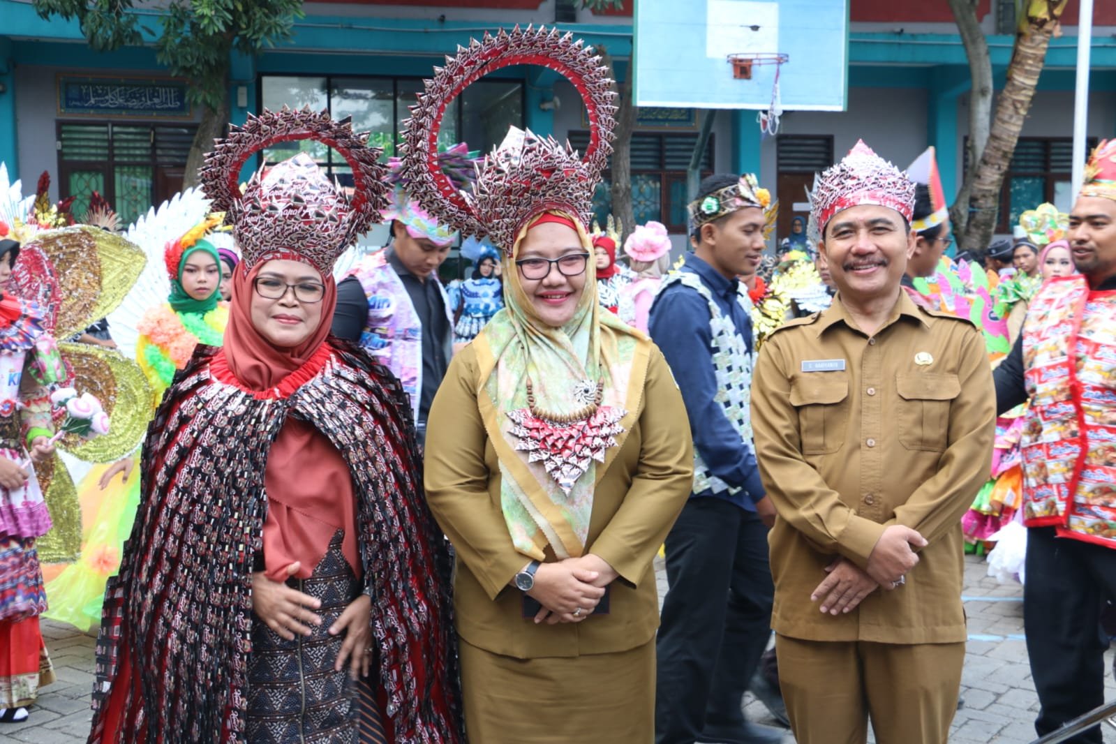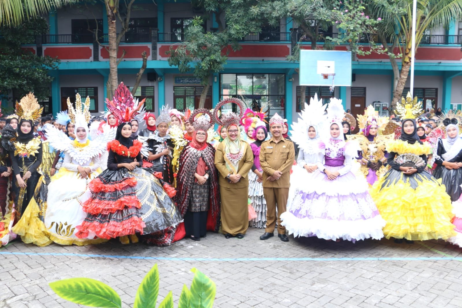 Dengan mengenakan kostum dari plastik dan sampah daur ulang, para siswa tampak mempesona menampilkan pertunjukan seni tari. Hal serupa juga dilakukan oleh tamu undangan, termasuk Wakil Bupati Gresik Aminatun Habibah yang tampak cantik mengenakan mahkota dari plastik daur ulang.