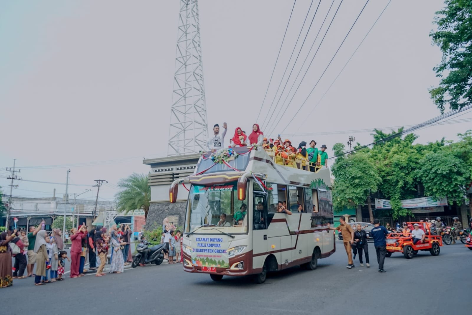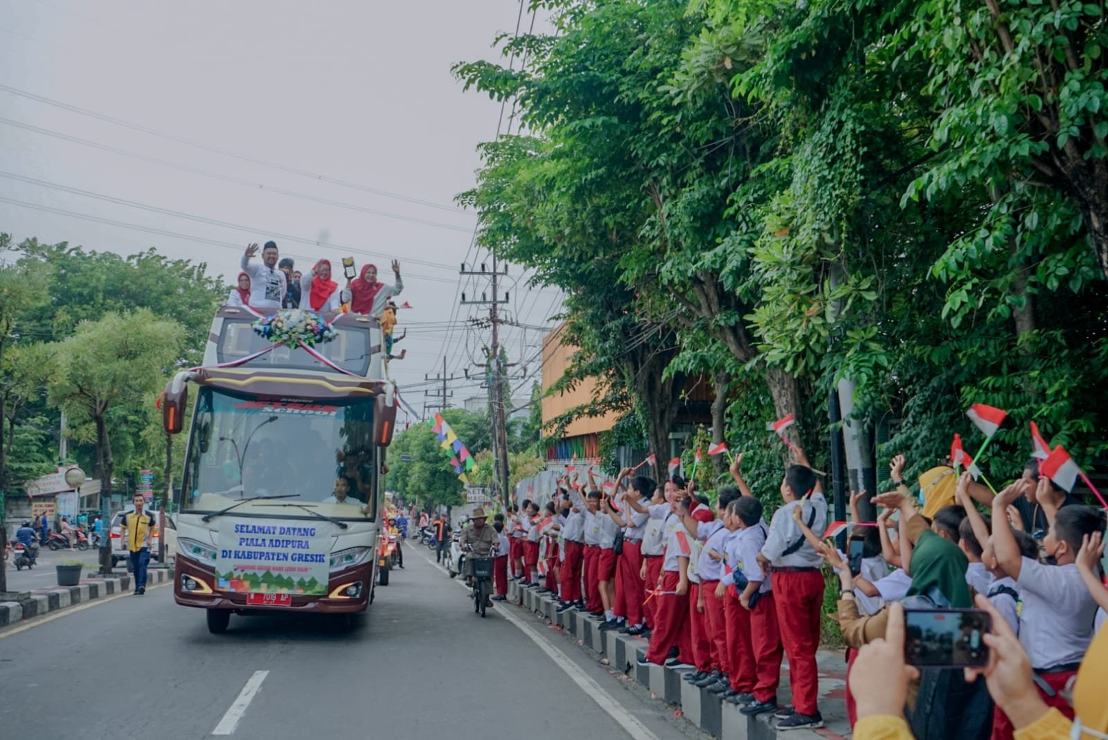 GRESIK, SabdaNews.com- Bupati Gresik Fandi Akhmad Yani dan Wakil Bupati Aminatun Habibah bersama jajaran melakukan kirab menyambut Piala Adipura yang diterima dari Kementerian Lingkungan Hidup dan Kehutanan (KLHK), Selasa (04/03). Diiringi sambutan masyarakat yang luar biasa, mereka memulai kirab dari Tugu Selamat Datang Kabupaten Gresik menggunakan Bus Wisata Grissee.