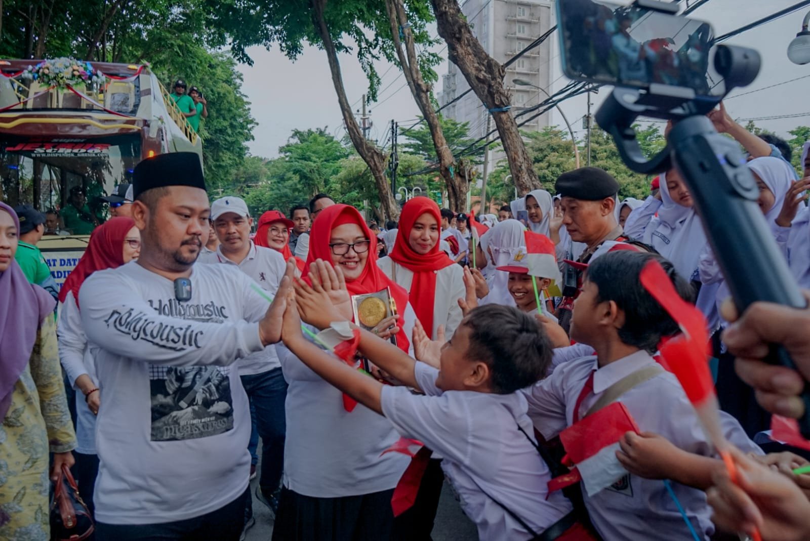 Kegembiraan juga terlihat jelas di wajah Bupati Fandi Akhmad Yani. Orang nomor satu di Kabupaten Gresik tersebut tak henti-hentinya melambaikan tangan dan menyapa warga masyarakat yang menyemut di sepanjang rute pawai. Memasuki Jalan Panglima Sudirman, rombongan konvoi disambut ratusan pelajar yang berdiri di sepanjang pedestrian jalan. Mereka tampak melambai-lambaikan bendera merah putih sambil mengucapkan selamat. Sambutan pelajar dan masyarakat makin padat saat rombongan memasuki Jalan Jaksa Agung Suprapto, mendekati titik finish kirab yakni Gedung WEP.