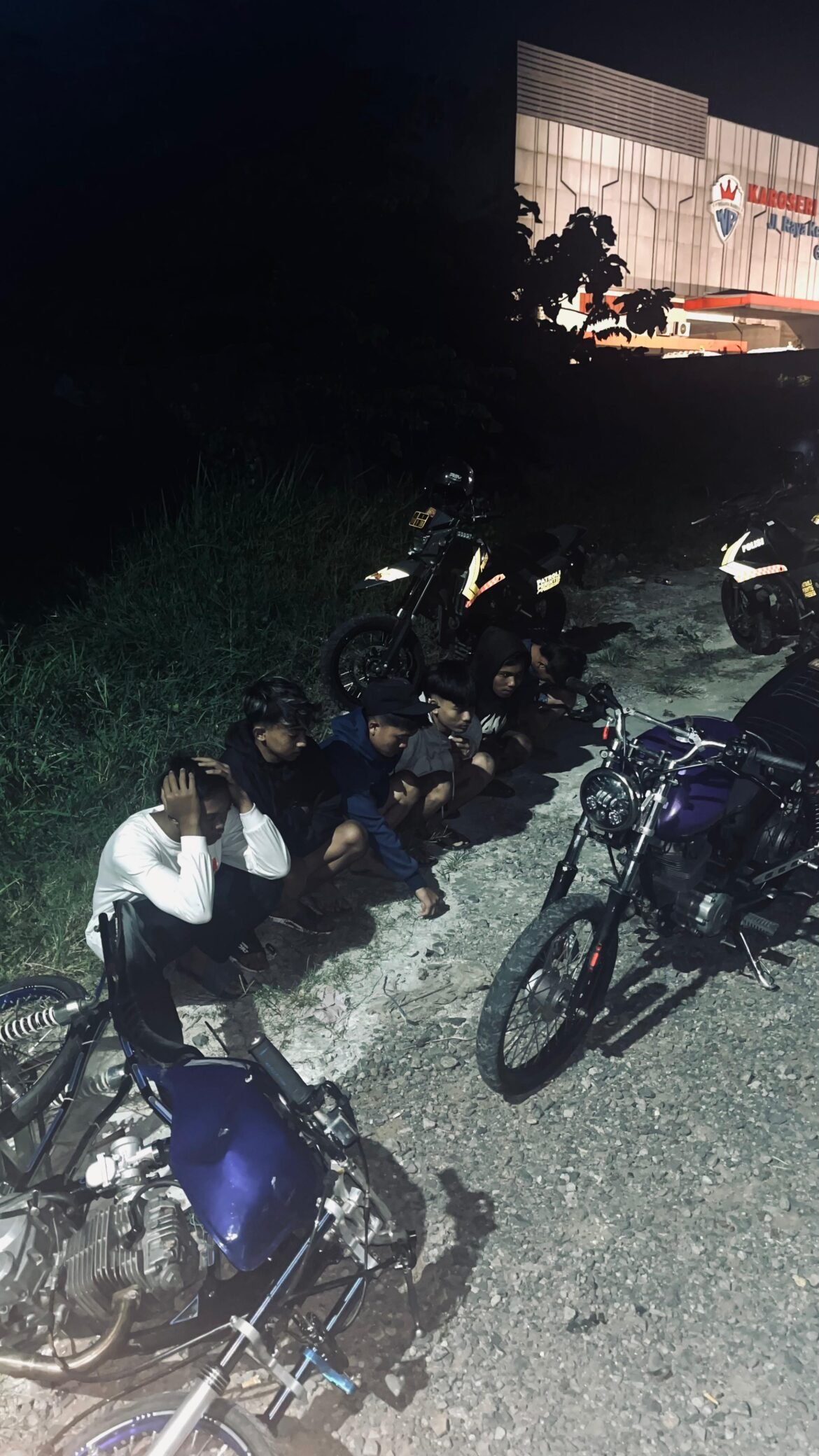 Dua unit motor yang dimodifikasi ditemukan di tempat terpisah, satu tersimpan di semak-semak bahu jalan, dan satu lagi di bawah rerimbunan pohon sekitar 10 meter dari lokasi pertama. Total, empat sepeda motor diamankan, terdiri dari dua Honda Tiger berknalpot brong dan dua unit Vario matic tanpa pelat nomor. Enam pemuda yang diamankan berasal dari wilayah Gresik dan Surabaya. Mereka berinisial ERF, IIP, PPR, EAS, MFL, dan MABP. Empat di antaranya masih di bawah umur.