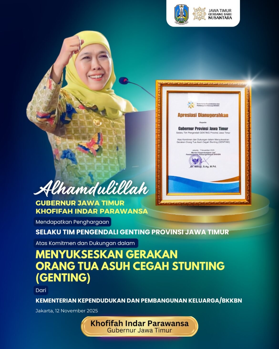 “Penghargaan Genting ini adalah buah dari sinergi semua pihak baik pemerintah provinsi, pemerintah kabupaten/kota, desa, Perwakilan BKKBN Prov. Jawa Timur, PKK, Mitra Pentahelix, serta Pembina Posyandu yang terlibat dalam Gerakan Orang Tua Asuh Cegah Stunting masyarakat. Ini kerja gotong royong untuk masa depan generasi Jatim,” ujar Khofifah di Surabaya, Rabu (19/11/2025) di tengah kunker misi dagang Jawa Timur – Sulawesi Tenggara di Kendari Sulawesi Tenggara.