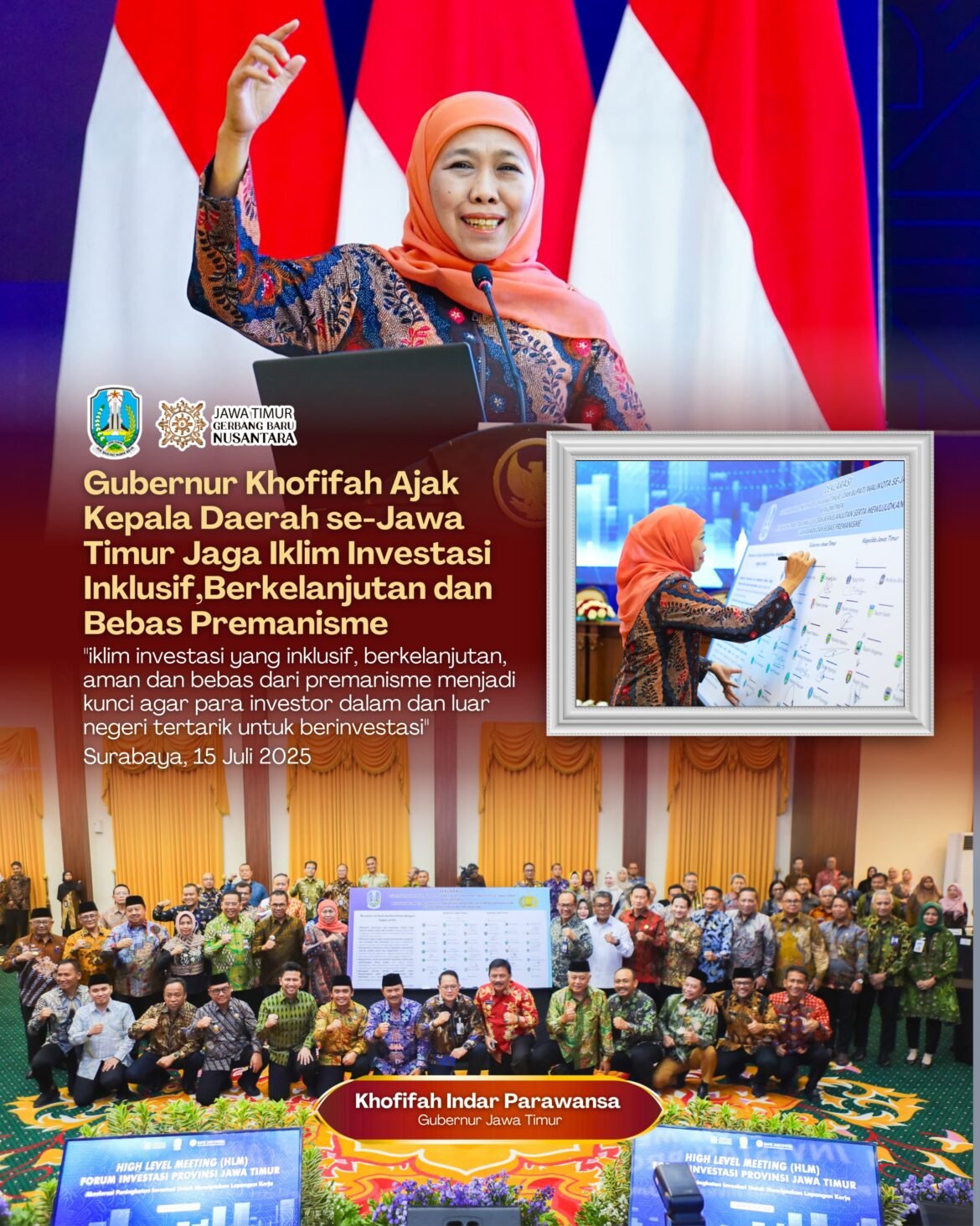 SabdaNews.com – Gubernur Jawa Timur Khofifah Indar Parawansa terus berupaya menciptakan iklim investasi di Jawa Timur yang inklusif, berkelanjutan, aman dan bebas dari premanisme. Salah satu upaya itu dengan cara mendorong dan menguatkan komitmen bersama Kepala Daerah se-Jatim, melalui High Level Meeting (HLM) Forum Investasi Jawa Timur yang diselenggarakan di Gedung Negara Grahadi Surabaya, Selasa (15/7/2025).
