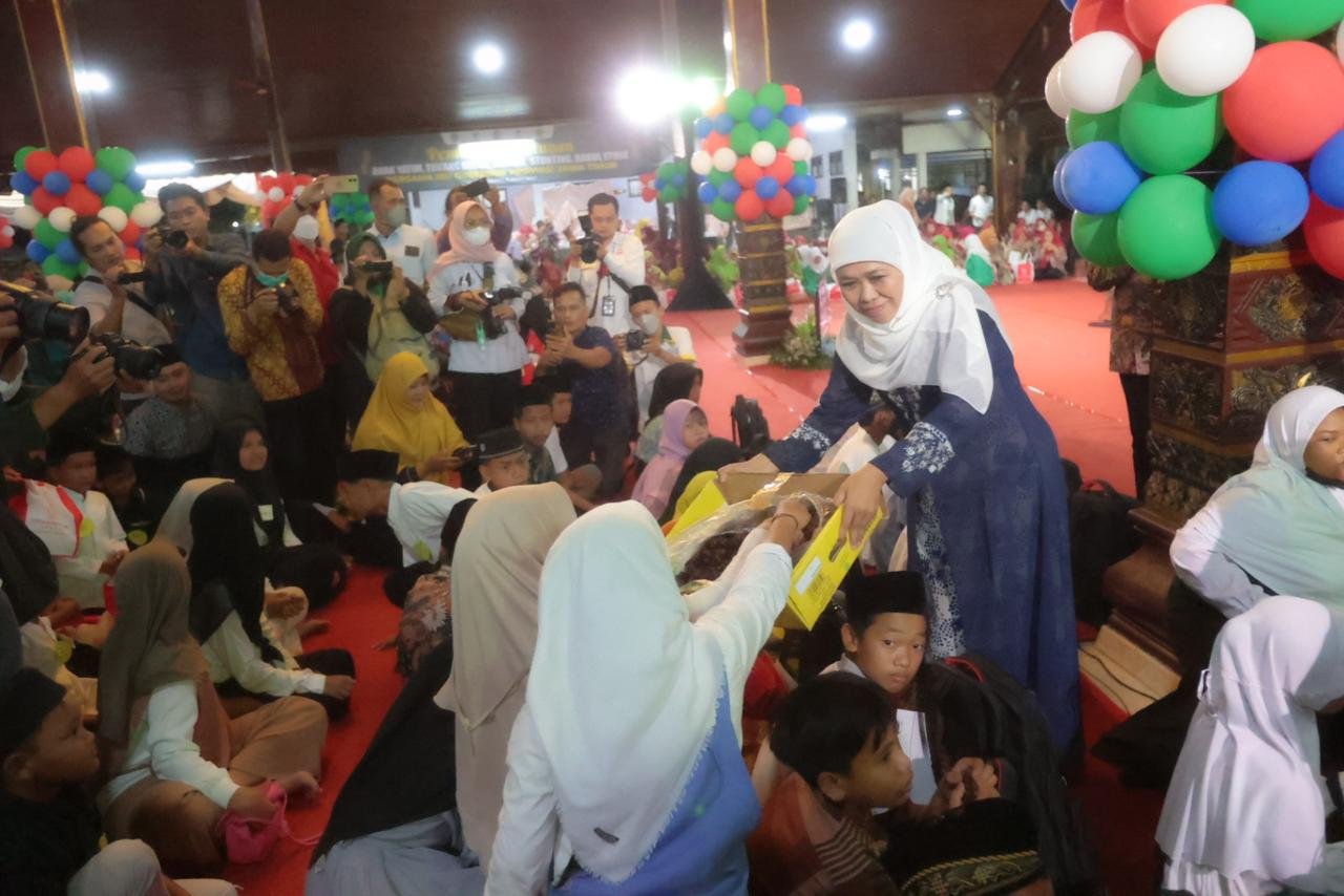 Menjelang berbuka, Gubernur perempuan pertama di Jatik ini kembali menciptakan momen istimewa dengan menghampiri langsung anak-anak yatim piatu untuk membagikan kurma.