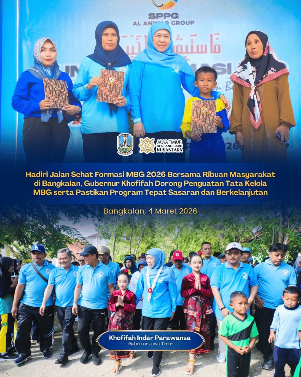 Hal tersebut disampaikan Guberur Khofifah saat menghadiri kegiatan Jalan Sehat Formasi MBG 2026 di Halaman SPPG Al Anwar Group, Bangkalan, Sabtu (4/4/2026).