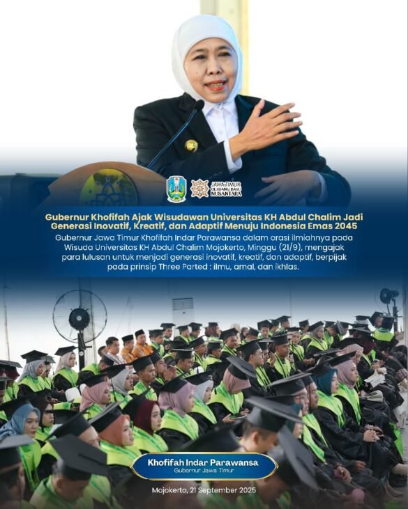 MOJOKERTO.SabdaNews.com  – Gubernur Jawa Timur Khofifah Indar Parawansa mengajak para wisudawan Universitas KH Abdul Chalim Mojokerto untuk menjadi generasi inovatif, kreatif, dan adaptif, sekaligus berlandaskan pada prinsip Three Parted: Ilmu, Amal, dan Ikhlas.