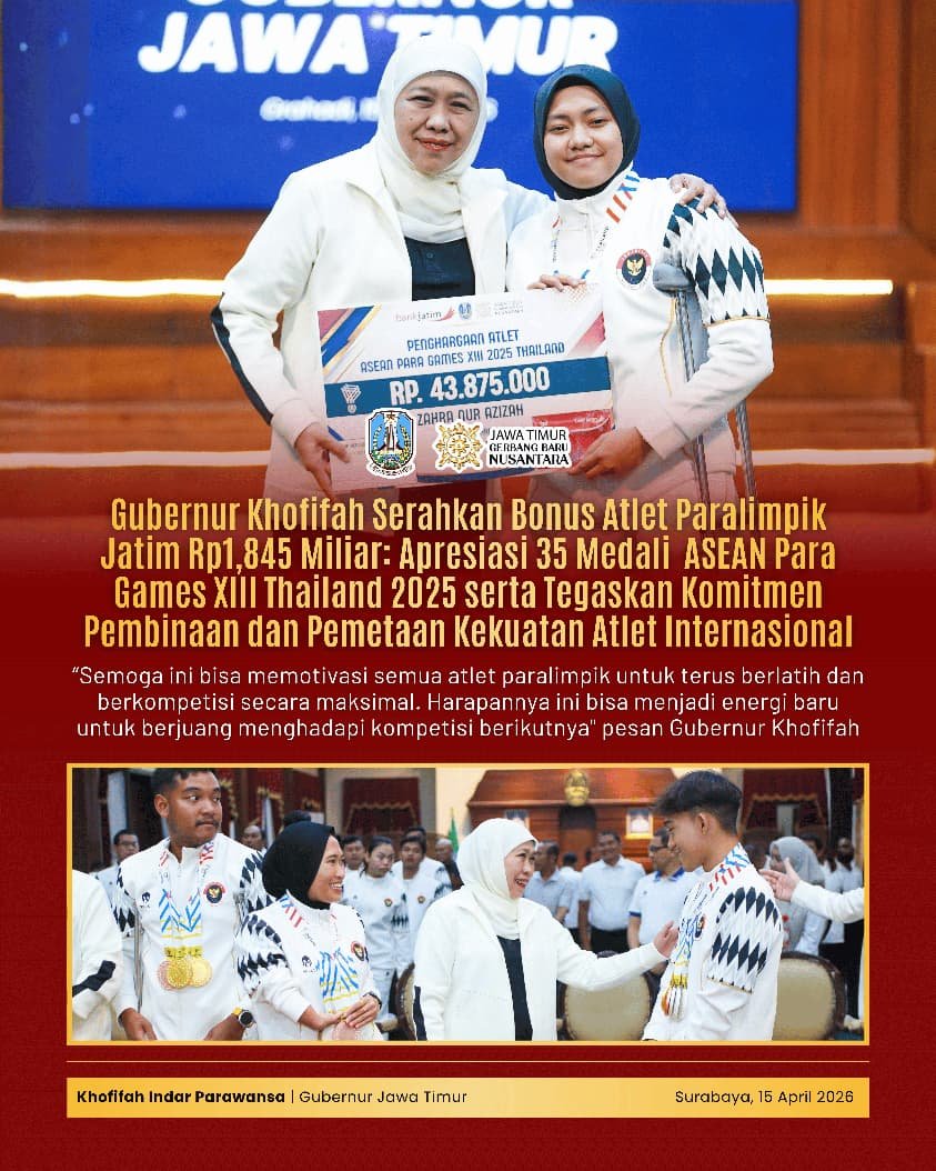 SabdaNews.com  – Gubernur Jawa Timur Khofifah Indar Parawansa memberikan penghargaan berupa bonus apresiasi senilai total Rp1,845 miliar kepada 15 atlet paralimpik dan dua pelatih Jawa Timur yang berprestasi pada ajang ASEAN Para Games 2025 di Thailand.