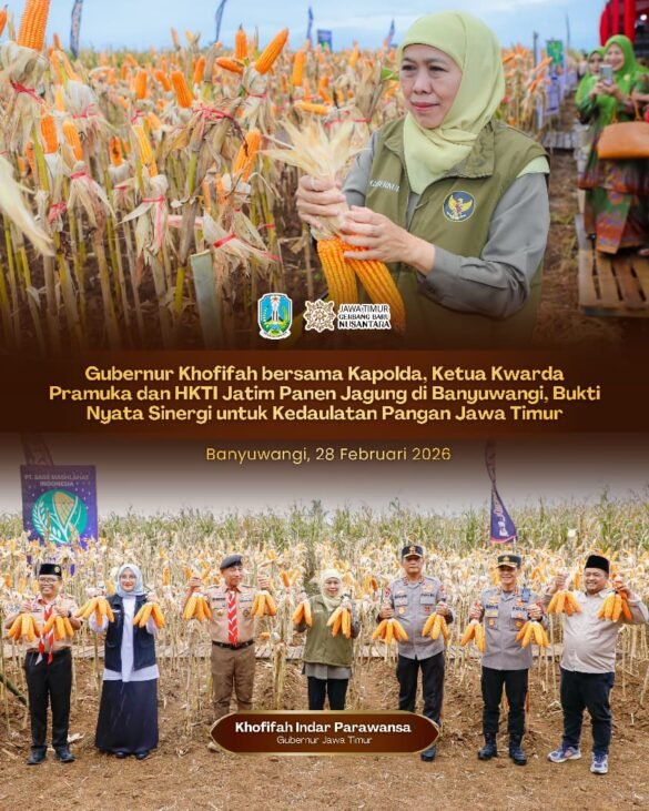 BANYUWANGI.SabdaNews.com – Gubernur Jawa Timur Khofifah Indar Parawansa bersama Kapolda Jatim Irjen Pol Nanang Avianto, Bupati Banyuwangi Ipuk Fiestiandani, Ketua Kwarda Pramuka Jatim dan Ketua Himpunan Kerukunan Tani Indonesia (HKTI) Jatim H. M. Arum Sabil melaksanakan panen jagung hasil tanam kuartal IV Tahun 2025 di Pusat Pelatihan Pertanian Taruna Bumi, Green Farm, Desa Karangsari, Kecamatan Sempu, Kabupaten Banyuwangi, Sabtu (28/2/2026).