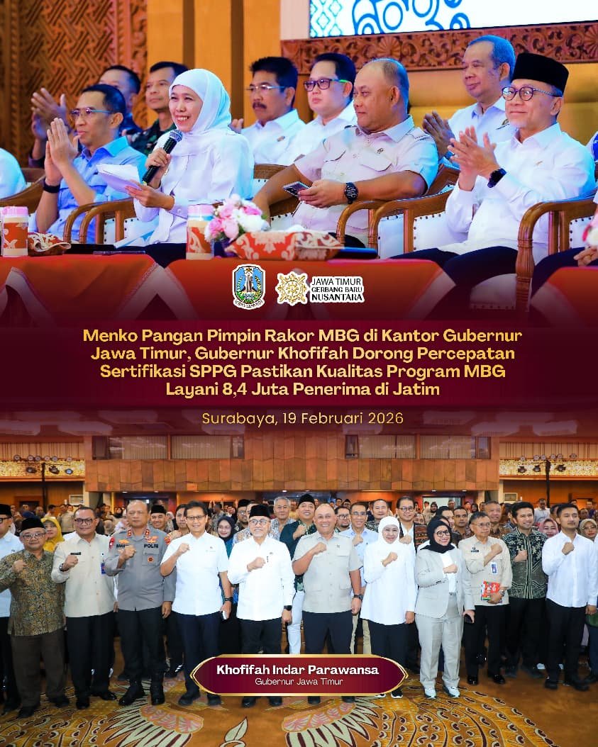 SabdaNews.com – Gubernur Jawa Timur Khofifah Indar Parawansa bersama Menteri Koordinator Bidang Pangan Zulkifli Hasan menggelar Rapat Koordinasi Penyelenggaraan Program Makan Bergizi Gratis (MBG) di Provinsi Jawa Timur yang digelar di Ruang Hayam Wuruk Kantor Sekretariat Daerah Provinsi Jawa Timur, Surabaya, Kamis (19/2/2026).