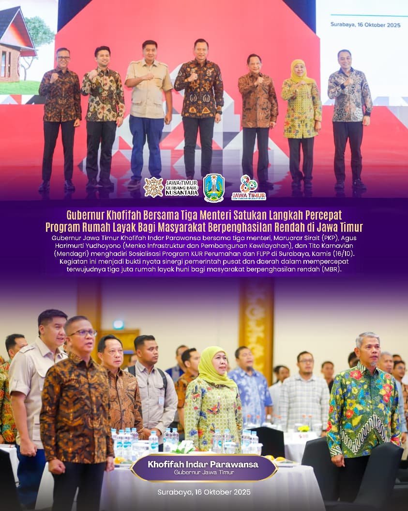SabdaNews.com– Pemerintah Provinsi Jawa Timur dengan Pemerintah Pusat kembali menunjukkan sinergitas yang kuat melalui kehadiran tiga menteri bersama Gubernur Khofifah Indar Parawansa dalam kegiatan Sosialisasi Program Kredit Usaha Rakyat (KUR) Perumahan dan Fasilitas Likuiditas Pembiayaan Perumahan (FLPP) di Hotel Shangri-La dan Dyandra Convention Center Surabaya, Kamis (16/10/2025).