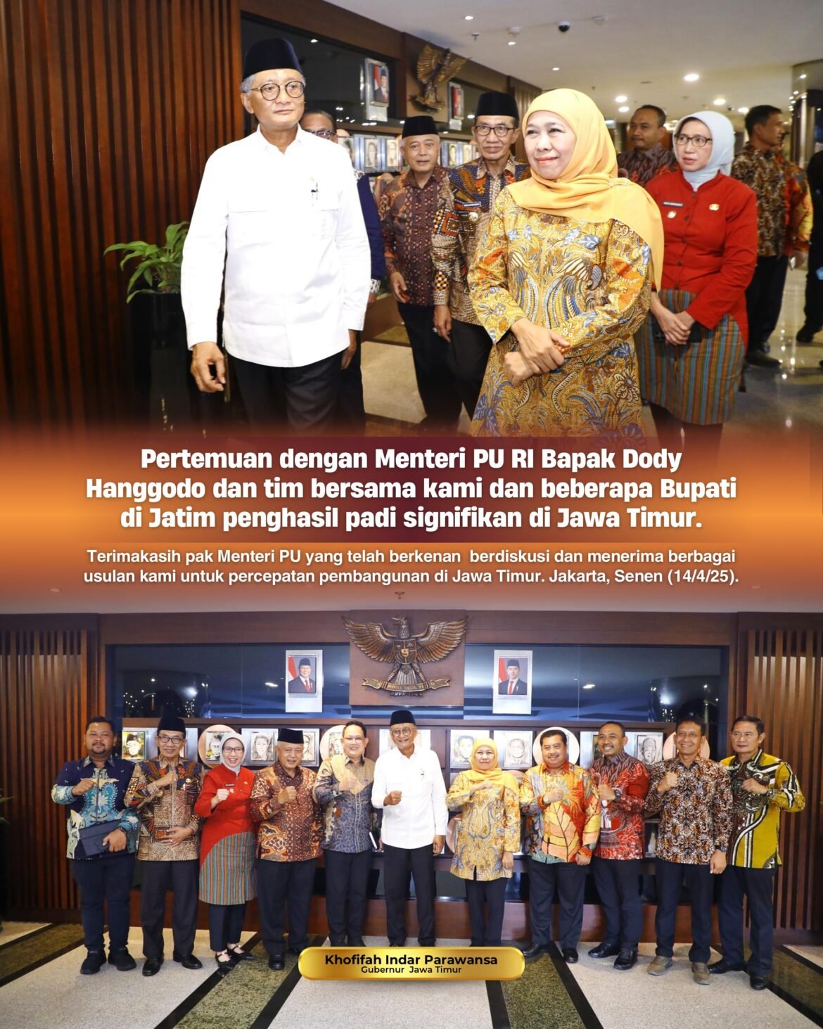 “Kami membutuhkan dukungan dari Kementerian PU untuk mempercepat rehabilitasi jaringan irigasi yang rusak dan mengembangkan saluran baru yang dibutuhkan petani,” ungkap Khofifah saat pertemuan dengan Menteri Pekerjaan Umum (PU) Dody Hanggodo di Kantor Kementrian PU RI Jakarta, Senin (14/4/2025).