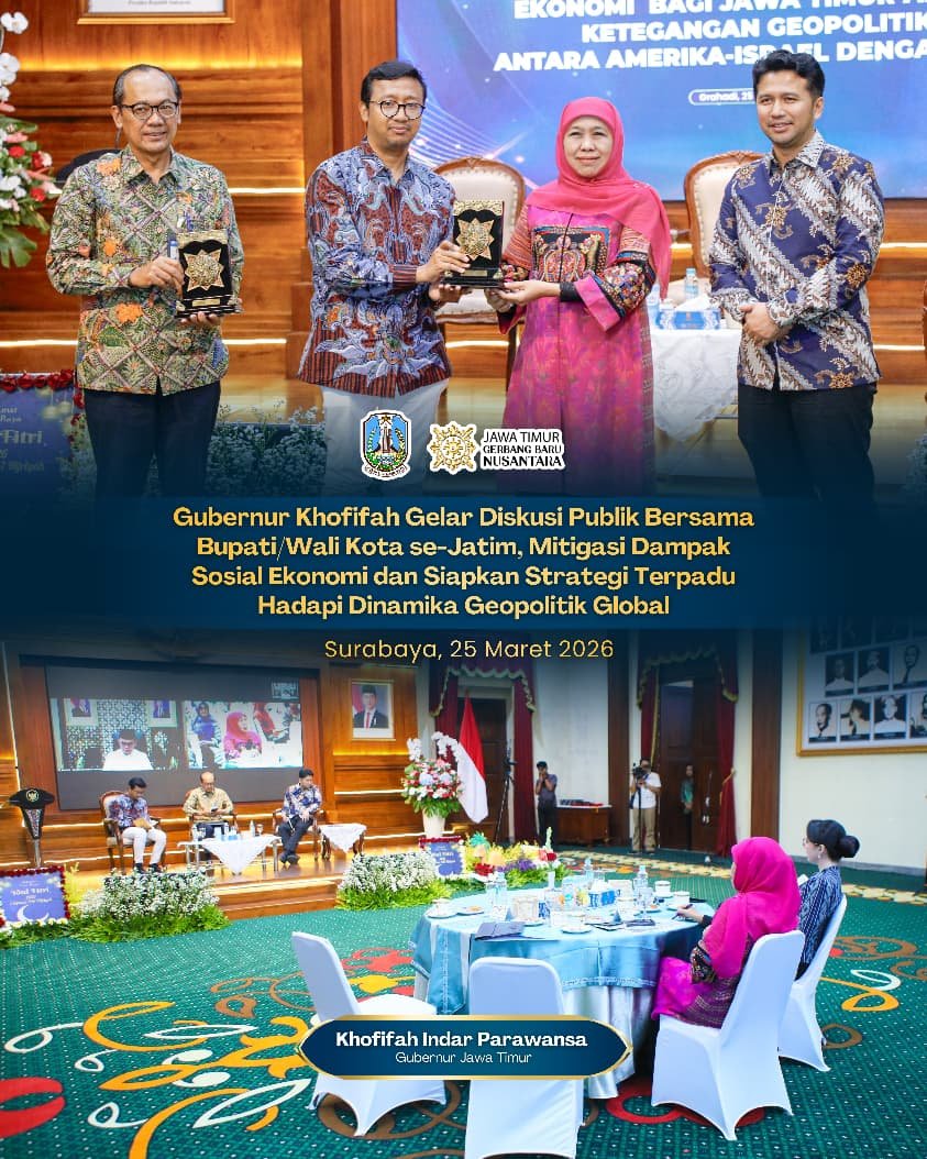 Diskusi yang mengambil tema “Mitigasi dan Solusi Dampak Sosial Ekonomi bagi Jawa Timur Akibat Ketegangan Geopolitik antara Amerika- Israel dengan Iran” ini sekaligus menjadi momentum hala l bihalal dalam suasana Idul Fitri 1447 Hijriah.