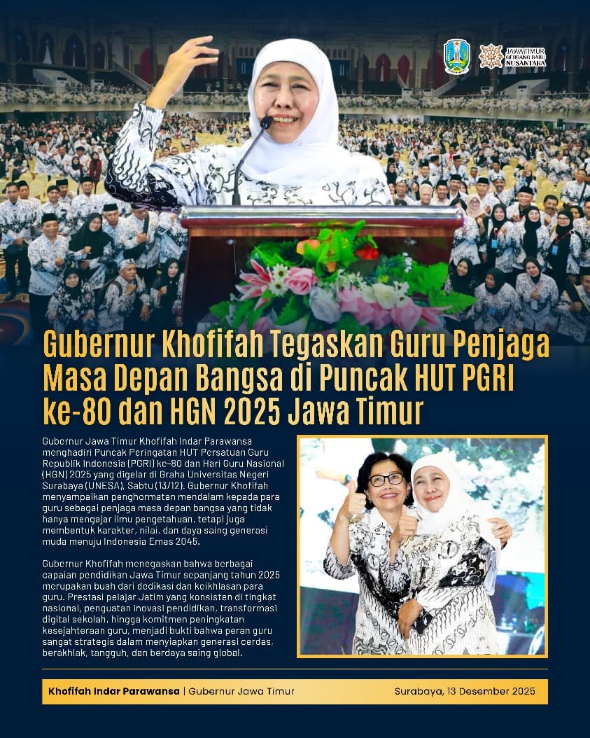 SabdaNews.com – Gubernur Jawa Timur Khofifah Indar Parawansa menyampaikan penghormatan kepada para guru sebagai pembentuk karakter geberasi masa depan . Hal ini disampaikan saat menghadiri Puncak Peringatan Hari Ulang Tahun (HUT) Persatuan Guru Republik Indonesia (PGRI) ke-80 dan Hari Guru Nasional (HGN) 2025 Tingkat Provinsi Jawa Timur di Graha Universitas Negeri Surabaya (UNESA), Sabtu (13/12/2025).