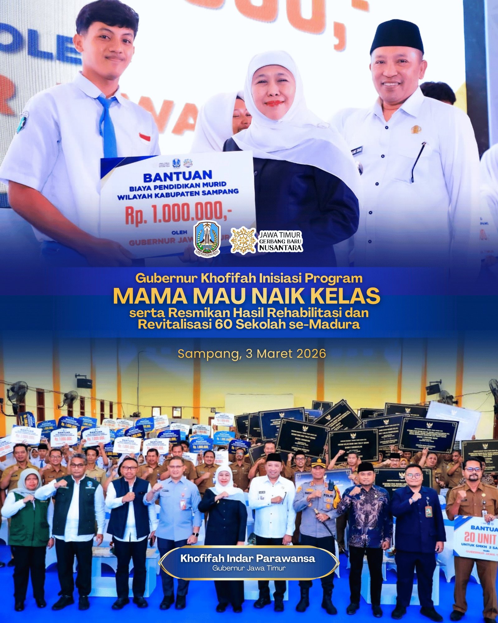 Gubernur Khofifah menegaskan bahwa program MAMA MAU NAIK KELAS bukan sekadar slogan, melainkan gerakan terukur untuk mendorong Madura memiliki keunggulan kompetitif dan komparatif di bidang pendidikan.