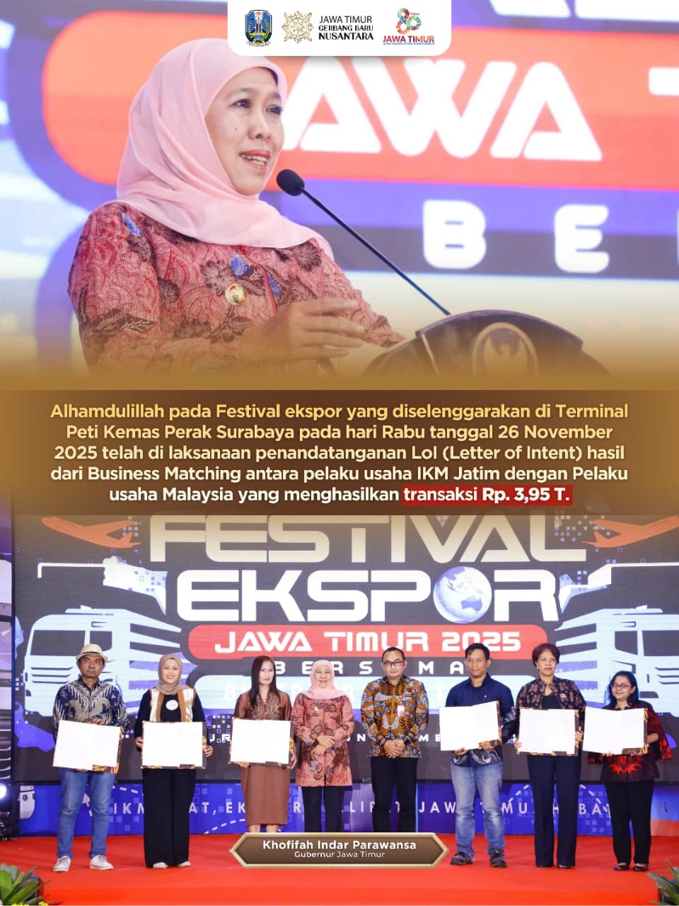 SabdaNews.com – Sebanyak empat pelaku usaha Jawa Timur menandatangani LoI (Letter of Intent) dengan Atase Perdagangan Malaysia dalam rangkaian Festival Ekspor Jawa Timur Tahun 2025 di PT. Terminal Petikemas Surabaya, Rabu (26/11/2025) kemarin.