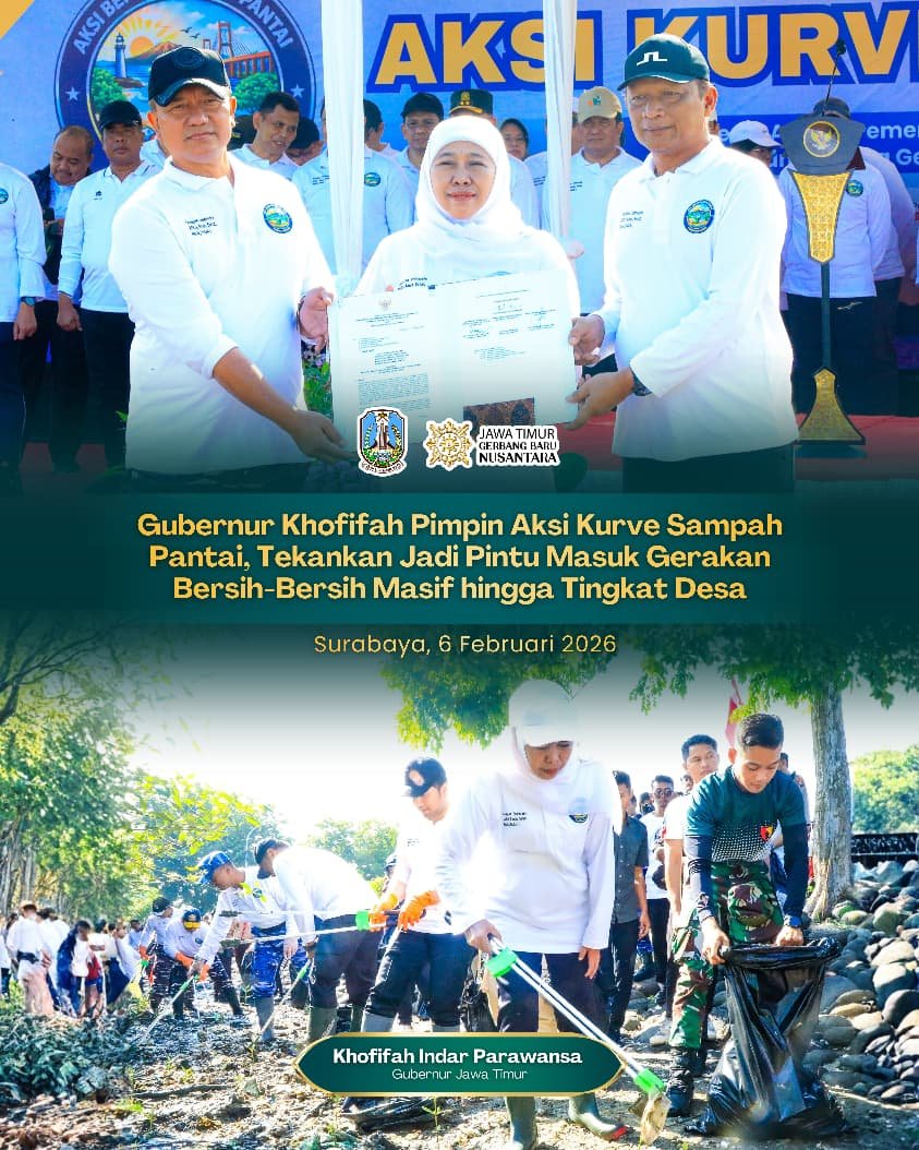SabdaNews.com  – Gubernur Jawa Timur Khofifah Indar Parawansa memimpin apel dan aksi Kurve Sampah Pantai yang digelar bersama jajaran Forum Koordinasi Pimpinan Daerah (Forkopimda) Jawa Timur di di Pantai Tambak Wedi, Kecamatan Kenjeran, Surabaya, Jumat (6/2/2026).