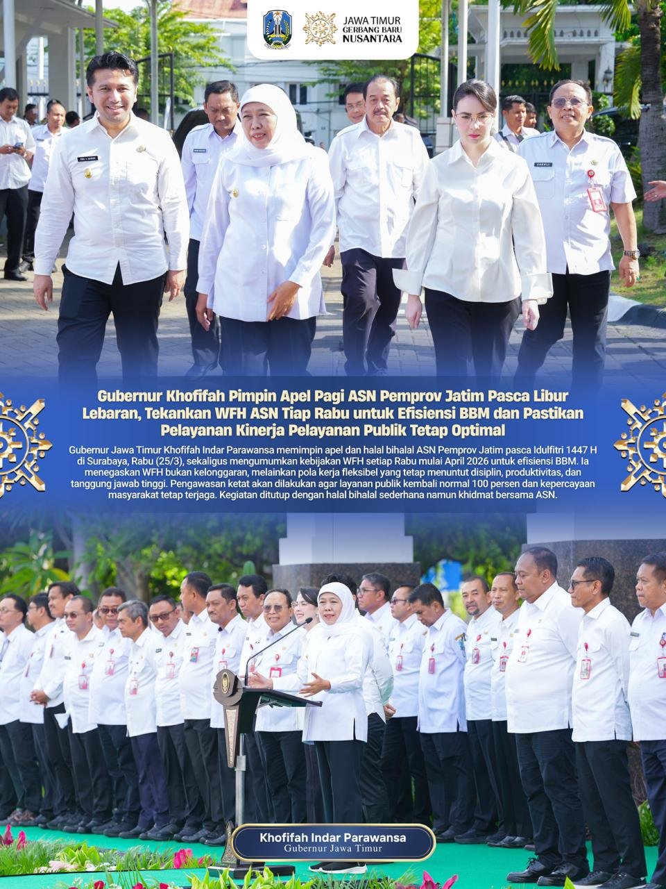 Dalam kesempatan tersebut, Gubernur Khofifah mengumumkan bahwa Pemerintah Provinsi Jawa Timur akan mulai menerapkan kebijakan Work From Home (WFH) bagi ASN setiap hari Rabu, yang akan diberlakukan mulai awal April 2026.