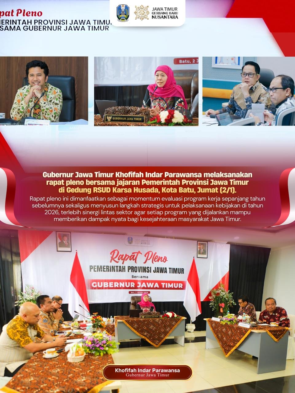 Gubernur Khofifah menegaskan rapat pleno menjadi kegiatan penting bagaimana menyinkronkan sekaligus mengevaluasi perjalanan 2025. Tak hanya evaluasi, ini juga merupakan momentum Pemprov Jatim menyiapkan rencana strategis di tahun 2026.