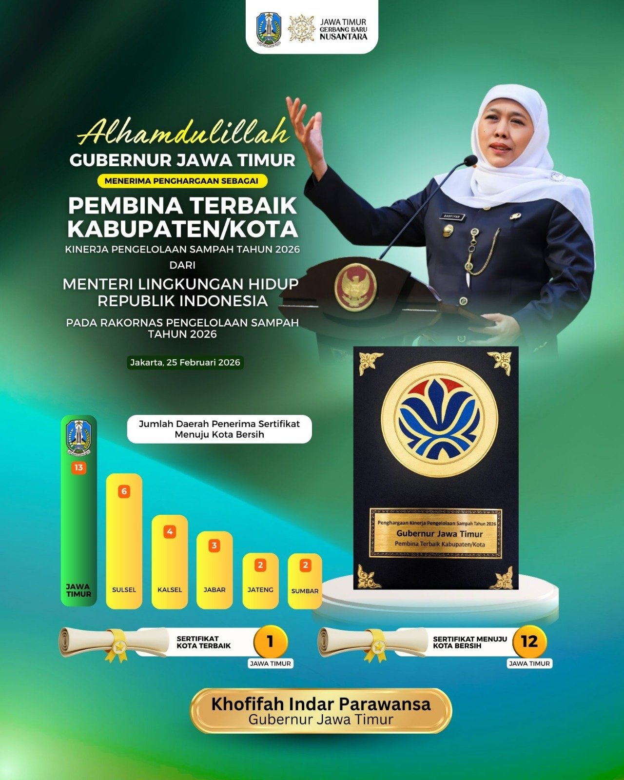 Prestasi ini tidak lepas dari keberhasilan Jawa Timur memperoleh 13 sertifikat dari total 35 sertifikat malalui 2 kategori terdiri dari 1 sertifikat Kota Terbaik dan 12 kabupaten/ kota mendapatkan Sertifikat Menuju Kota Bersih. Perolehan ini sekaligus menjadi yang terbanyak dibandingkan provinsi lain di Indonesia.