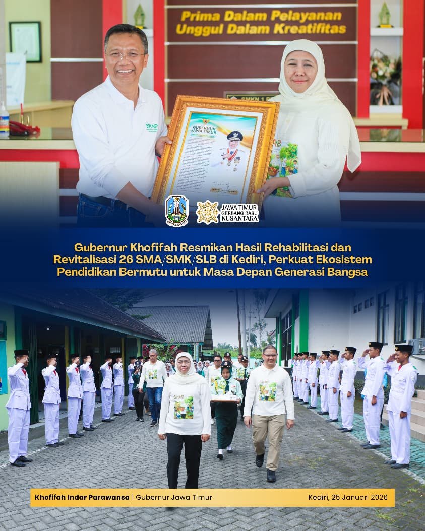 KEDIRI.SabdaNews.com – Gubernur Jawa Timur Khofifah Indar Parawansa meresmikan hasil rehabilitasi dan revitalisasi 26 SMA, SMK, dan SLB negeri maupun swasta di Kabupaten dan Kota Kediri, Minggu (25/1/2026) lalu, sebagai bagian dari transformasi pendidikan Jawa Timur yang berkelanjutan.