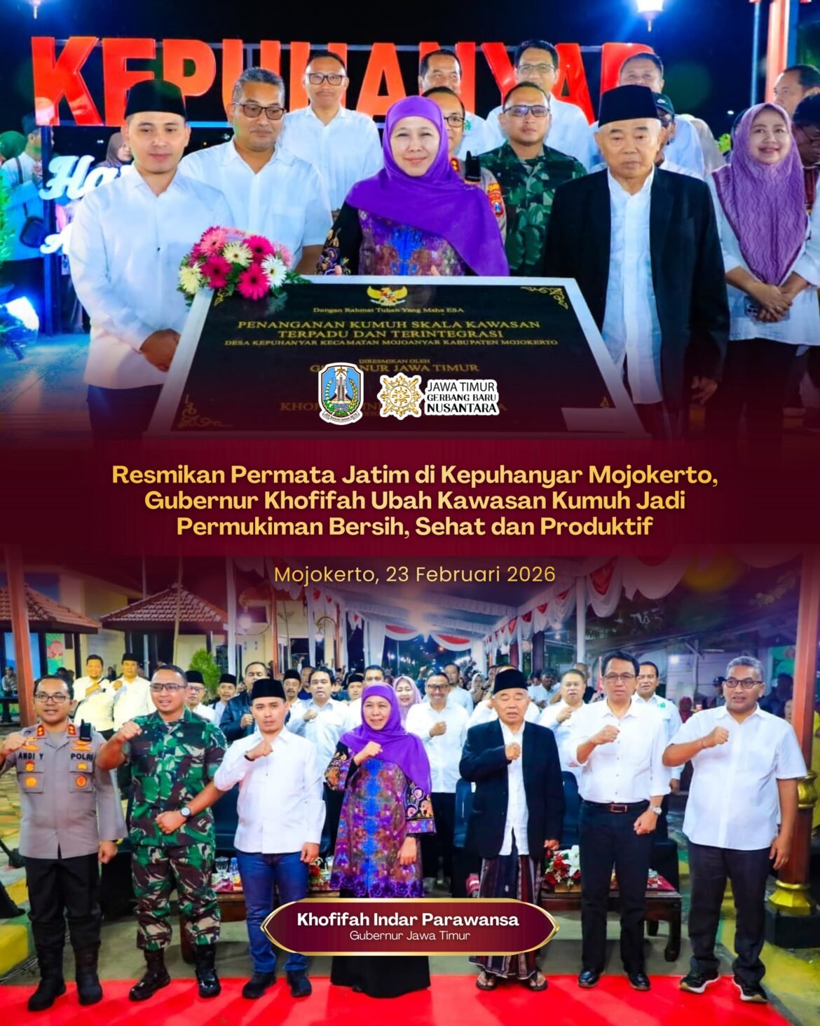 MOJOKERTO.SabdaNews.com – Gubernur Jawa Timur Khofifah Indar Parawansa meresmikan Penanganan Kumuh Skala Kawasan Terpadu dan Terintegrasi melalui Program Permata Jatim di Desa Kepuhanyar, Kecamatan Mojoanyar, Kabupaten Mojokerto, Senin (23/2/2026) malam.