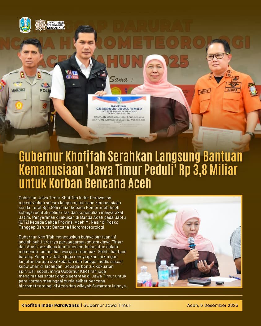 “Saya, Pak Sekda, dan yang hadir di sini tidak hanya mewakili Pemprov tetapi mewakili masyarakat Jawa Timur. Kita ingin menyampaikan kepedulian kami kepada masyarakat Aceh yang sedang mengalami musibah Hidrometeorologi,” kata Gubernur Khofifah.