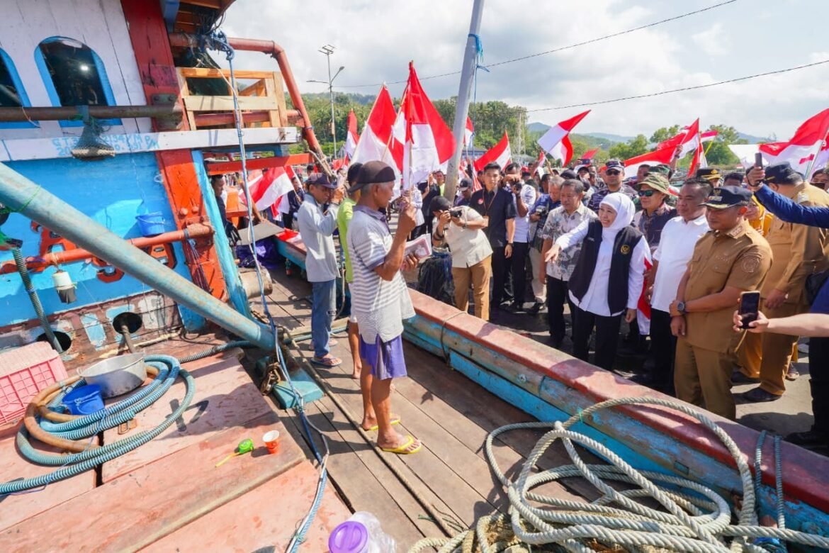 PACITAN.SabdaNews.com – Gubernur Jawa Timur Khofifah Indar Parawansa menyerahkan berbagai bantuan khusus bagi nelayan Kabupaten Pacitan di Pelabuhan Tamperan Pacitan, Selasa (12/8/2025) pagi.