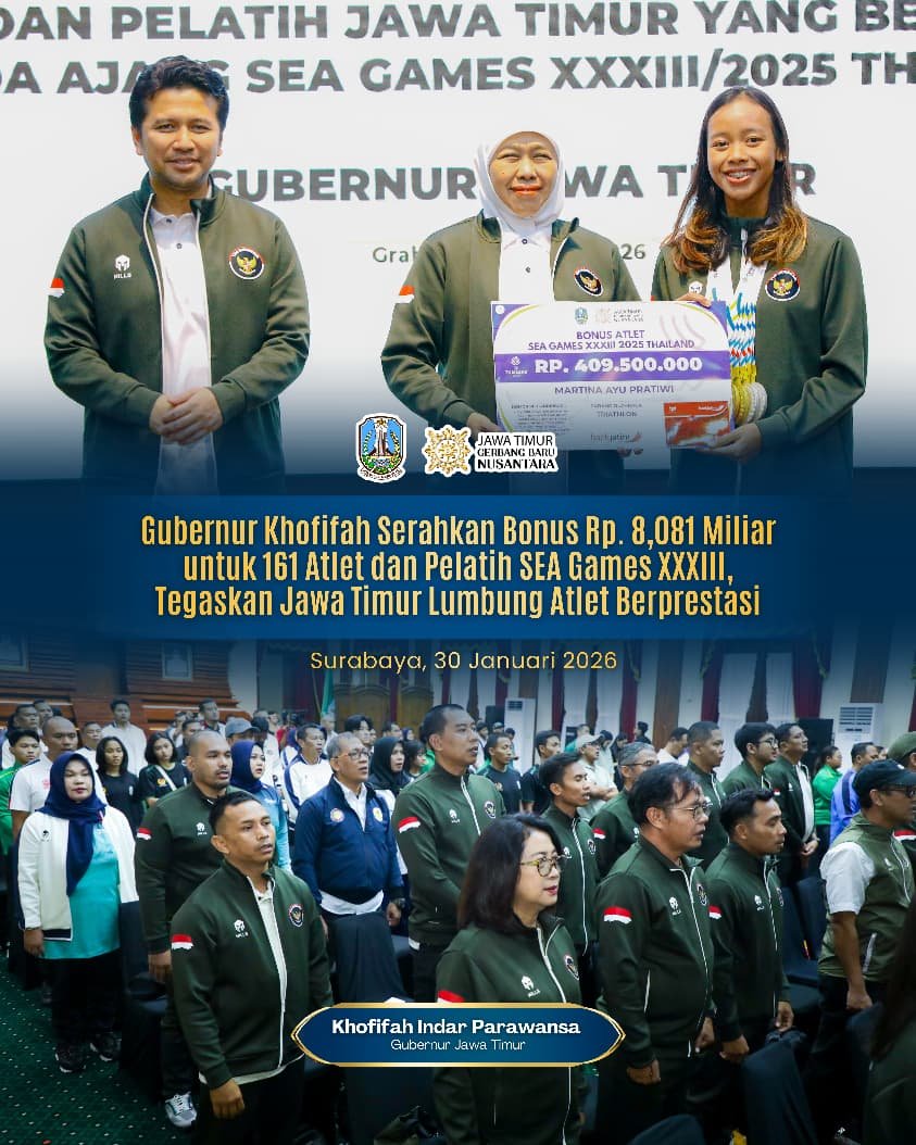 SabdaNews.com – Gubernur Jawa Timur Khofifah Indar Parawansa memberikan apresiasi serta bonus kepada 161 Atlet dan Pelatih asal Jatim yang berprestasi dalam laga SEA Games XXXIII tahun 2025 di Thailand pada Desember lalu.