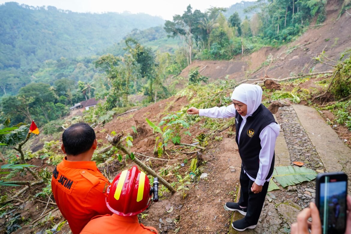 Menyusuri medan curam dan licin, Gubernur Khofifah hadir di tengah warga terdampak, untuk memastikan proses penanganan berjalan maksimal, pencarian korban dilakukan secara intensif, serta warga terdampak mendapatkan perlindungan dan layanan menyeluruh.
