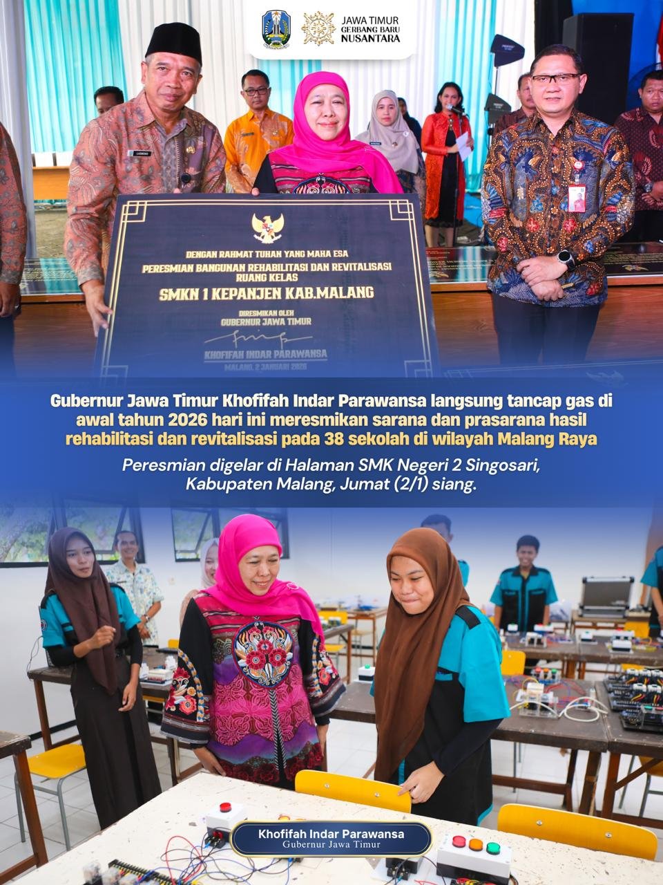 MALANG.SabdaNews.com – Gubernur Jawa Timur Khofifah Indar Parawansa langsung tancap gas di awal tahun 2026 hari ini meresmikan sarana dan prasarana hasil rehabilitasi dan revitalisasi pada 38 sekolah di wilayah Malang Raya. Peresmian digelar di Halaman SMK Negeri 2 Singosari, Kabupaten Malang, Jumat (2/1/2026).