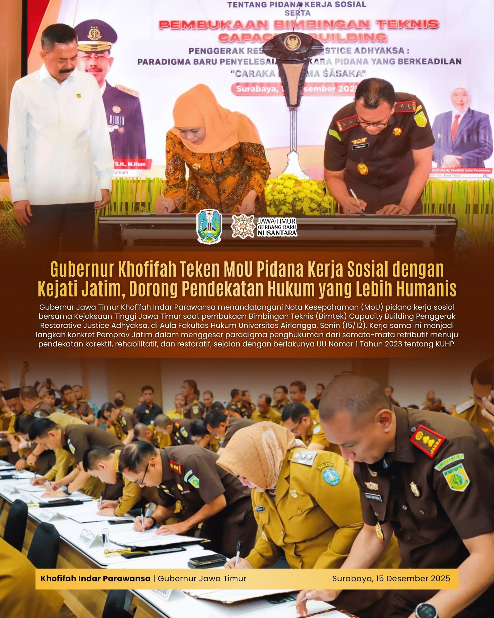Menurut Gubernur Khofifah, penandatanganan MoU ini bukan sekadar simbol kerja sama antar institusi. Melainkan menjadi fondasi penting dalam penerapan pidana kerja sosial yang manusiawi, produktif dan berdampak langsung kepada masyarakat.