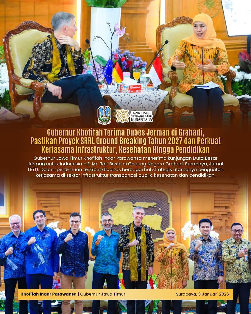 SabdaNews.com – Gubernur Jawa Timur Khofifah Indar Parawansa menerima kunjungan Duta Besar Jerman untuk Indonesia H.E. Mr. Ralf Beste di Gedung Negara Grahadi Surabaya, Jumat (9/1/2026).