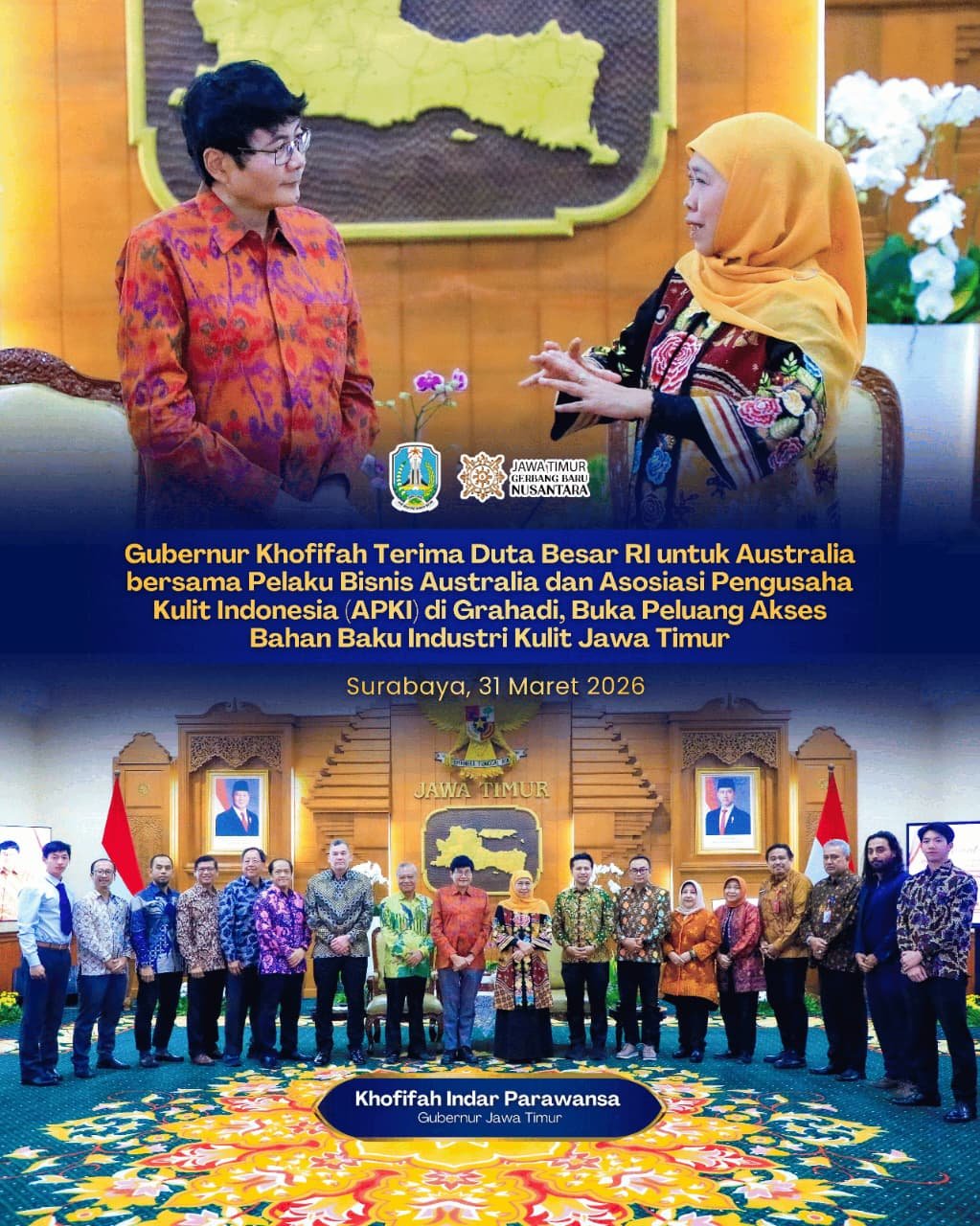 SabdaNews.com  – Gubernur Jawa Timur Khofifah Indar Parawansa menerima kunjungan kerja Duta Besar Republik Indonesia untuk Australia di Canberra, Y.M. Dr. Siswo Pramono yang juga lengkap Pelaku Bisnis Australia serta Asosiasi Pengusaha Kulit Indonesia (APKI) di Gedung Negara Grahadi Surabaya, Selasa (31/3/2026) malam.