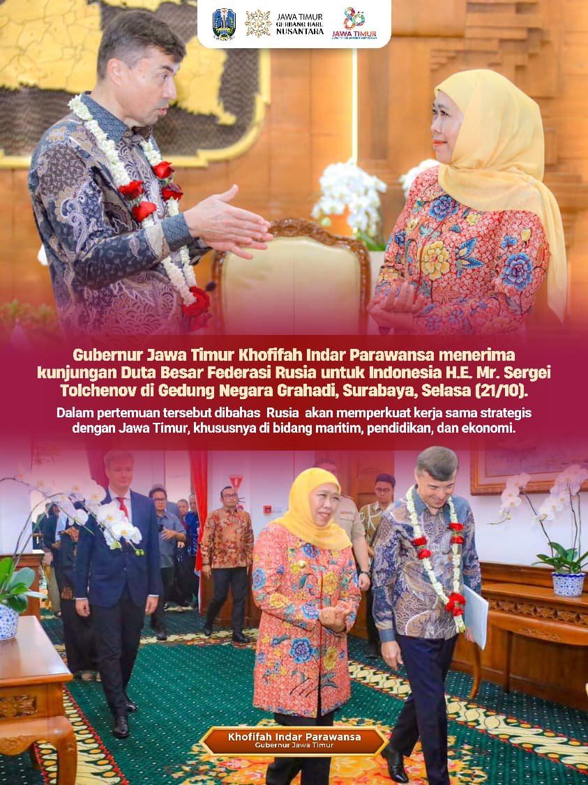 Dalam pertemuan tersebut, Gubernur Khofifah mengajak Rusia memperkuat kerja sama strategis dengan Jawa Timur, khususnya di bidang maritim, pendidikan, dan ekonomi.