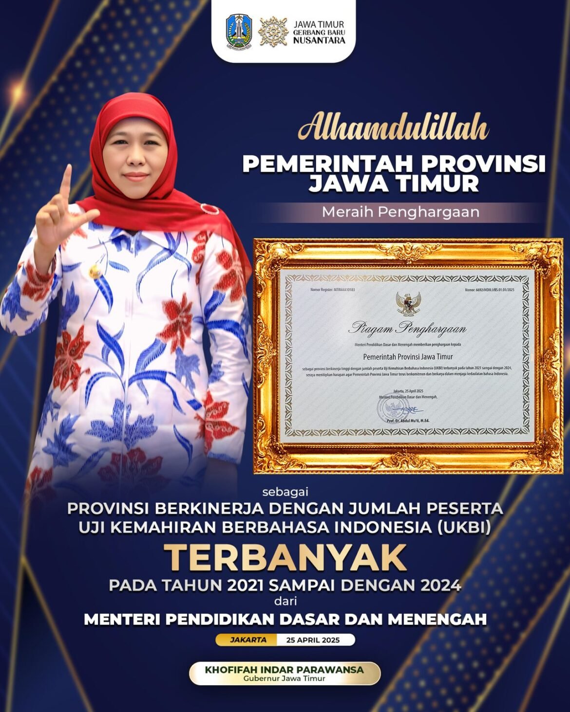 Penghargaan tersebut diserahkan Menteri Pendidikan Dasar dan Menengah Republik Indonesia Prof. Dr. Abdul Mu’ti kepada Gubernur Jatim Khofifah Indar Parawansa. Penghargaan diberikan saat peluncuran Pedoman Pengawasan Penggunaan Bahasa Indonesia dan Pencanangan Komitmen Bersama Menjaga Kedaulatan Bahasa Indonesia di Plaza Insan Berprestasi, Gedung A, Lt. 1, Kompleks Kementerian Pendidikan Dasar dan Menengah, (Kemendikdasmen) Senayan, Jumat, (25/4/2025).