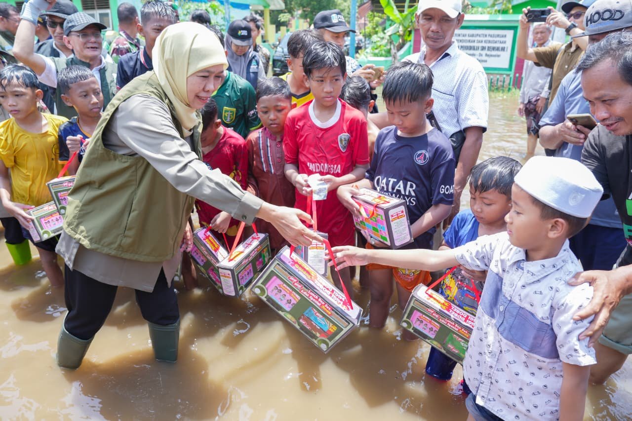 Di sela peninjauan, Khofifah juga menyempatkan berinteraksi dengan anak-anak terdampak banjir dan membagikan mainan untuk menjaga keceriaan dan menghibur mereka di tengah situasi bencana.