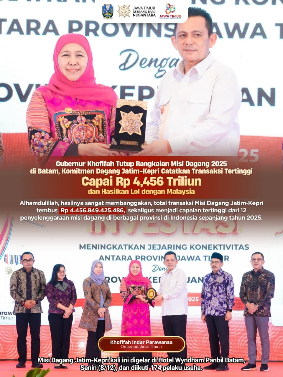 Alhamdulillah, hasilnya sangat membanggakan, total transaksi Misi Dagang Jatim-Kepri tembus Rp 4.456.849.425.486, sekaligus menjadi capaian tertinggi dari 12 penyelenggaraan misi dagang di berbagai provinsi di Indonesia sepanjang tahun 2025. Selain perdagangan Jatim–Kepri, kegiatan ini juga menghasilkan penandatanganan Letter of Intent antara pelaku usaha Jatim dengan Malaysia.